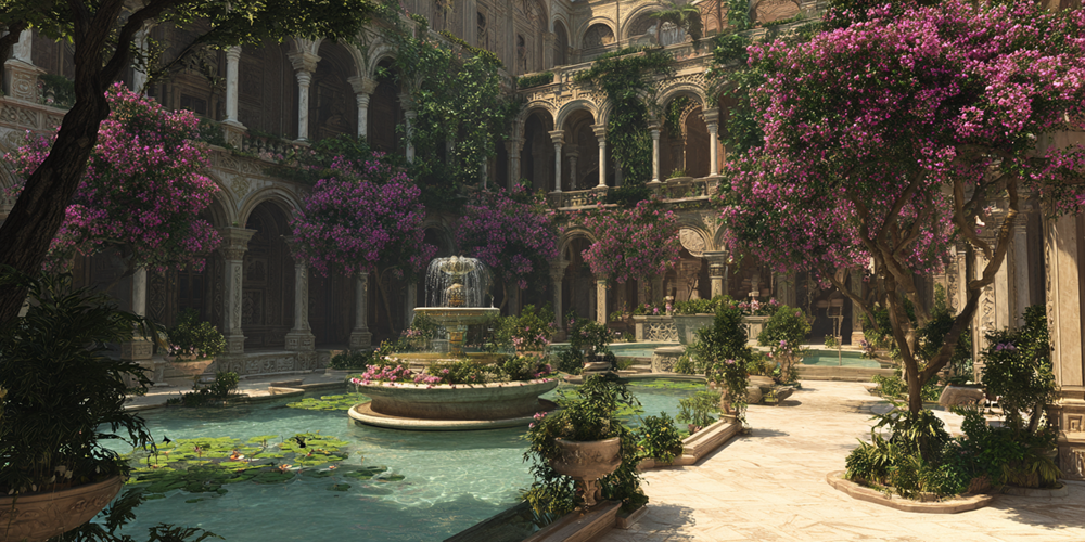 Saraylar, sütunlu avlularla birbirine bağlanmıştı ve meyve ağaçları, güller ve çiçeklerle bezenmiş bahçelerle, çayırlık alanlarla çevriliydi. Bahçelerde güvercinler, tavus kuşları, papağanlar ve kuğular yaşardı. Su kanalları ve çeşmeler vardı — bu korunaklı duvarlar içinde adeta küçük bir cennet gibiydi. Blakhernai su kemerinden gelen tatlı su, Manuel’in büyük salonunun tam ortasından geçerdi; iki yanında çiçekli ağaçlar yükselirdi. Su yolu mermerden oyulmuştu; içine işlenmiş özel desenler sayesinde suyun akışı müzik gibi bir ses çıkarırdı.