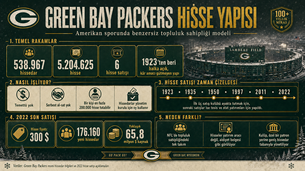 NFL, NBA, MLB ya da NHL denince akla gelen ilk şeylerden biri sert rekabet değil, o rekabetin arkasındaki büyük para olur. Amerikan spor düzeni uzun zamandır milyarder sahipler, dev medya anlaşmaları, kamu desteğiyle inşa edilen statlar, marka değerleri ve franchise mantığı üzerinden işler. Takımlar çoğu zaman şehirlerin kültürel hafızasının parçası gibi görünse de hukuki olarak son derece klasik birer sermaye yapısıdır. Green Bay Packers bu düzenin içinde baştan sona aykırı duran bir istisna. Kulüp 1923’ten beri halka açık, kâr amacı gütmeyen bir şirket yapısıyla yaşıyor. 2025 itibarıyla yaklaşık 5.204.625 hisse 538.967 hissedarın elinde bulunuyor; bu hisseler temettü ödemiyor ve kulüp bir yönetim kurulu ile yedi üyeli bir icra komitesi üzerinden yönetiliyor. Yani Packers, Amerikan profesyonel sporunda kelimenin gerçek anlamıyla patronu olmayan tek büyük örnek olarak ayakta duruyor.