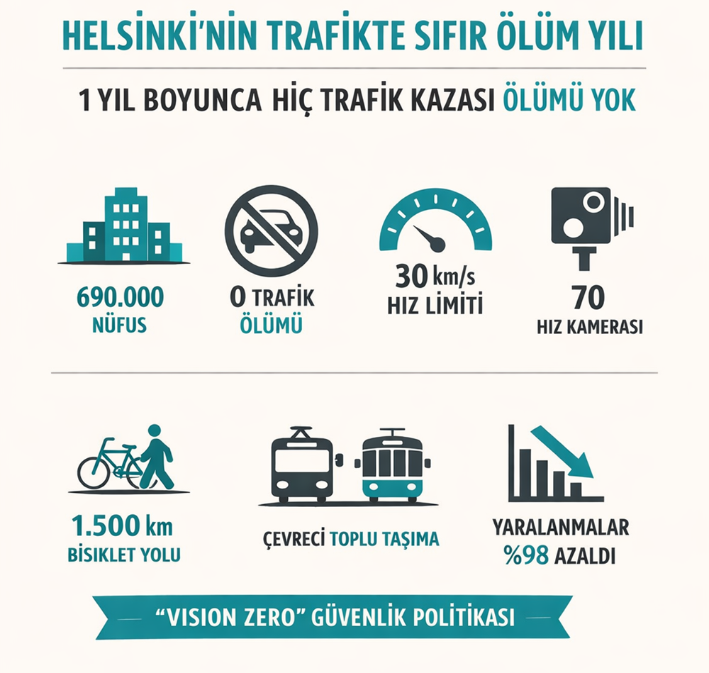 Yaklaşık 690 bin nüfuslu Helsinki, Avrupa başkentleri arasında görece küçük bir şehir olsa da metropol alanında yaşayan ve her gün şehre gidip gelenlerle birlikte yaklaşık 1,5 milyon kişilik bir hareketlilik barındırıyor. Bu ölçekte bir şehirde bir yıl boyunca trafik kaynaklı ölüm yaşanmaması, kent planlamacıları için önemli bir örnek olarak görülüyor.