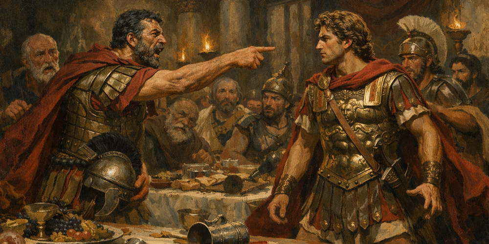 Gece ilerledikçe övgülerin dozu arttı. Alexander’ın başarıları büyütüldü, Philippos’un payı küçümsendi. Arrianos’un aktardığına göre Kleitos artık kendini tutamadı; Philippos’un yaptıklarını öne çıkardı, Alexander’ın yaptıklarını küçümsemeye başladı ve en sonunda Granikos’ta kralın hayatını kurtardığını yüzüne vurdu. İçkiyle kabaran bu sözler, aslında uzun süredir söylenemeyenlerin patlamasıydı. Bir dost, bir kurtarıcı, bir eski Makedon subayı, hükümdarının yüzüne onun efsane olmadığını hatırlatıyordu. Alexander için aşağılayıcı olan tam da buydu: İmparatorluk büyüdükçe çevresindeki herkes yükselmek için onu yüceltirken, Kleitos tam tersini yaptı ve onu birden yeniden ölümlüler dünyasına çekti.