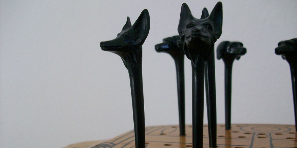 Petrie, 1890’da mezar kazılarında bu tahtalardan ilkini bulduğunda, neye baktığını tam olarak bilmiyordu. İki paralel sıra halinde dizilmiş 58 delik… Yıllar sonra bir başka İngiliz arkeolog Howard Carter, Thebes-Asasif’te bir mezarda çok daha zengin bir örnek bulduğunda, figürinlerin başları sayesinde oyuna bugünkü adını verdi: Biri köpek, diğeri çakal. En ünlü tahta bugün New York’taki The Met Museum’da; abanozdan yapılmış, fildişi kakmalı, çekmecesinde on adet pim saklıyor. Üst yüzeyinde bir hurma ağacı motifi var; bu ağaçtan yukarı çıkan yollar oyuncuların ilerlediği rotayı oluşturuyor. Oyunun zirvesinde, dairesel bir şen sembolü –ebediyetin halkası– yer alıyor.