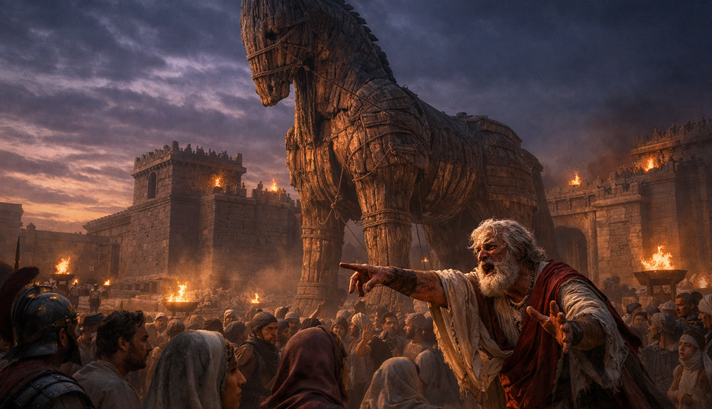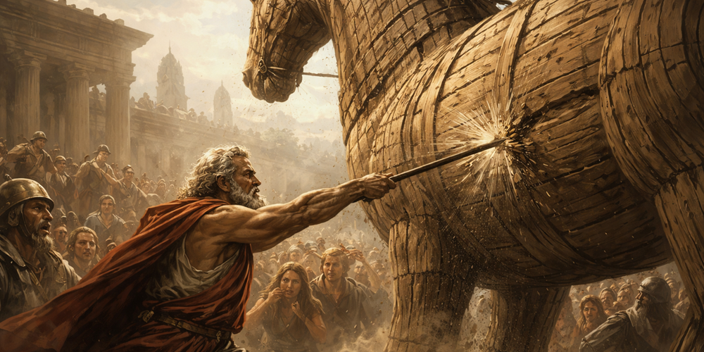Bazı anlatılarda bu sınır bedensel arzudur; kutsal bir rahibin evlenmesi ve çocuk sahibi olmasıyla tanrının öfkesini çekmesi… Bazılarında ise, rahipliğin düzenini değil, tanrısal stratejiyi bozduğu için cezalandırılır. Truva surları önüne bırakılan dev tahta atın ardındaki tuzağı fark eder ve halkı uyarır. Onun sesi, yüzyıllar boyunca yankılanan bir cümleyle özetlenir: “Ne olursa olsun, Atinalılardan korkarım, armağan getirenlerden bile.” Bu cümle, yalnızca Truva halkına değil, insanlığın bütün kolay inanma biçimlerine yöneltilmiş bir uyarı gibidir.