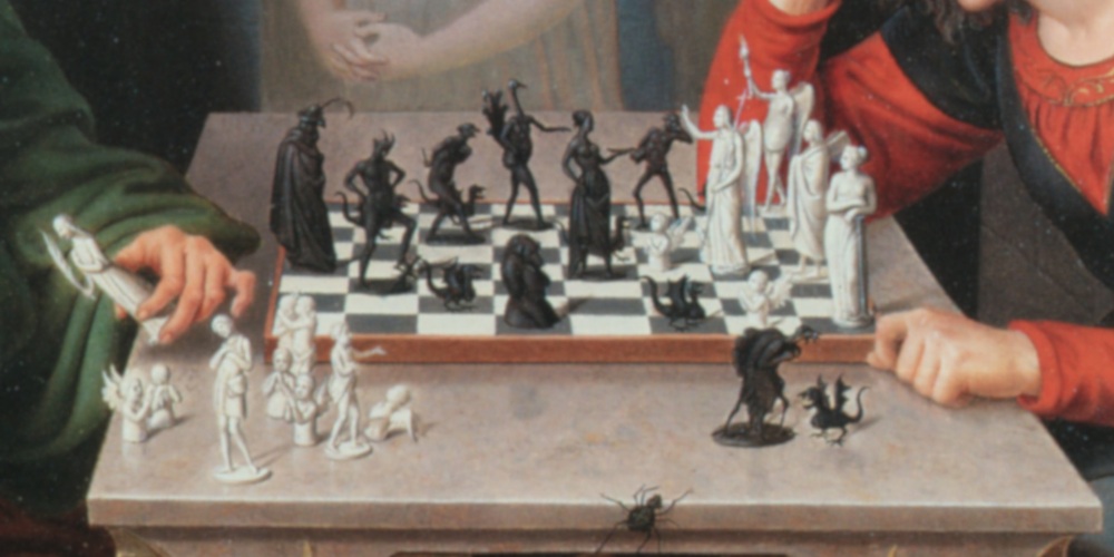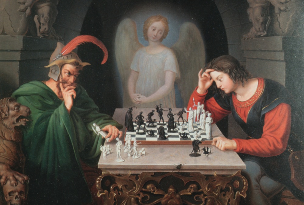 Alman ressam Moritz Retzsch, Die Schachspieler adını verdiği o ünlü sahnede satrançtan çok bir ruh hâlini resmeder. Geniş, kemerli bir mekânın içinde, iki yana doğru uzanan grotesk yaratıkların taşıdığı bir tonoz vardır. Ortada, bir lahit kapağı satranç tahtasına dönüştürülmüş, karelerin üstüne iki figür oturtulmuştur. Bir tarafta kendinden emin, neredeyse sıkılmış gibi yüzünü rakibine çeviren Şeytan; diğer tarafta ise eli başında, çökmüş omuzlarıyla taşlara bakan genç bir adam. Köşede, sessiz bir melek figürü bu sahnenin tanığı gibi durur.